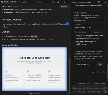 Prompt 2: "Change the button colour to purple and add a section with three features as cards."